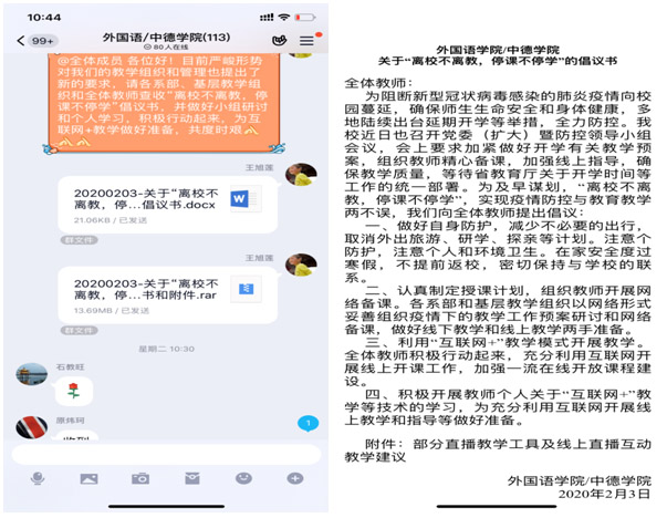 为阻断新型冠状病毒感染的肺炎疫情向校园蔓延,确保师生生命安全和身体健康,在校疫情防控办的领导下,外国语学院/三级片 迅速成立了疫情防控工作领导小组,并于2月3日发出《外国语学院/三级片 关于“离校不离教,停课不停学”的倡议书》,倡议全体教师做好自身防护,减少不必要的出行,不提前返校,密切保持与学校的联系,要求各系部和基层教学组织加紧做好开学有关教学预案,组织教师精心备课,加强在线教学技术培训,确保实现疫情防控与教育教学两不误。