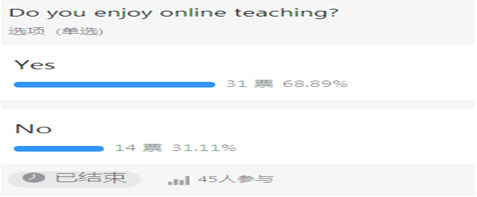 从投票结果发现,喜欢网络教学的学生占比接近70%,该比例与教务处所统计的“浙江科技学院网络教学质量日报”中的比例惊人相似。看到这个数据顺便可以进行现场教学,如何用英语描述统计结果。