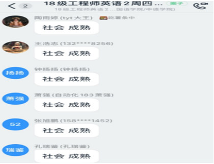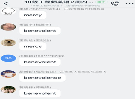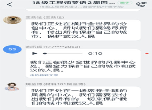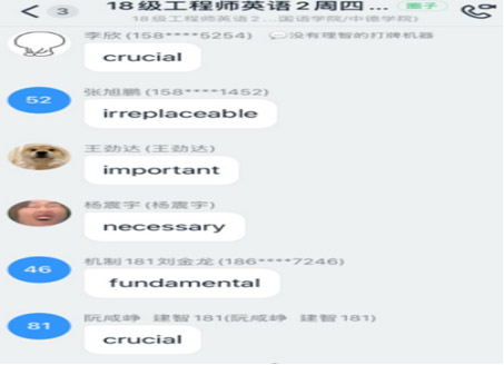 充分发挥手机能够无障碍语音输入功能、钉钉平台具有将语音及时转换成中文和英文的功能,以及每名学生均有电脑,可以快捷打字的便利。另外,教师也可以同步了解每一名学生的参与和学习情况,并同步了解学生中存在的问题,马上开展有的放矢的教学。如: