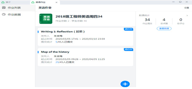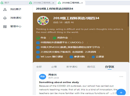 钉钉平台还有钉圈功能,打开我的圈子,有“分享区”,可以要求每名学生每周必须就本周的上课内容分享他/她的意见和建议,也可以告诉学生随时欢迎其分享学习经验、所见所闻、感慨等。教师可以在学生分享区参与评论。