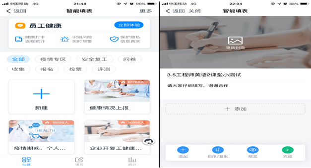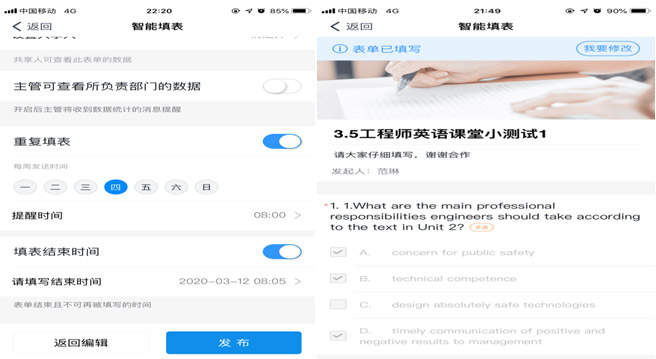 钉钉具有智能填表功能,教师可以利用这个功能在课堂上进行随堂小测试、听写单词,迅速组织学生互动参与到课堂中来;课后开展问卷调查。