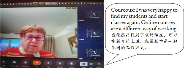Nadine Courcoux是来自法国的外教,今年是Courcoux在三级片 任教的第3年。寒假期间,她在马来西亚旅游时不幸被偷走了护照等资料,只好滞留在当地申办新护照。为此,Courcoux不得不改变计划,于2月中旬直接从马来西亚回到法国。由于Courcoux把法国住宅的钥匙放在学校听松公寓,她只能寄宿在朋友家里。Courcoux在知晓学校开展在线教学的消息后,主动提出要与学院同步,开展网络教学。由于法国与中国有7个小时的时差,而且Courcoux每周有两次要在上午上课,这个时候正好是法国的半夜。法语教研室考虑到其年纪较大,还有时差的问题,提出可以让其他老师代课或者推迟上课。Courcoux婉拒了这个提议,还是坚决地承担了所有的教学工作。在教研室同事多次远程指导下,她学会了使用钉钉群上课。她说:“很高兴能为学生上课,网课跟传统的上课方式很不一样,目前正在适应中,进展也比较顺利”。