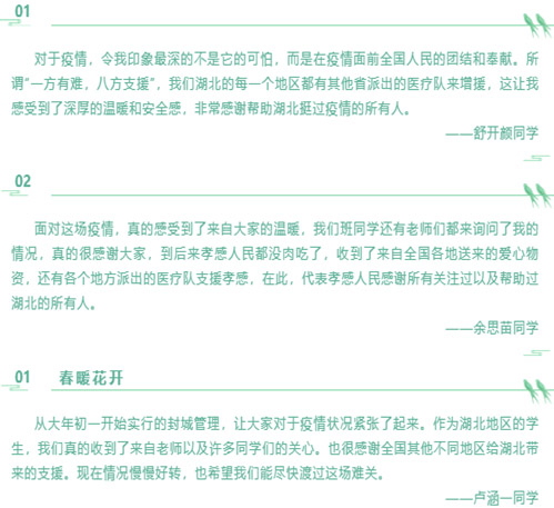 在英语172班团支部线上团日活动中,重灾区同学通过寄语的方式表达了这段时间他们的亲身感悟和对湖北人民的祝福。团支部成员相信在党中央的坚强领导下,全国人民上下一心,众志成城,这场战“疫”定能够尽早取得胜利。