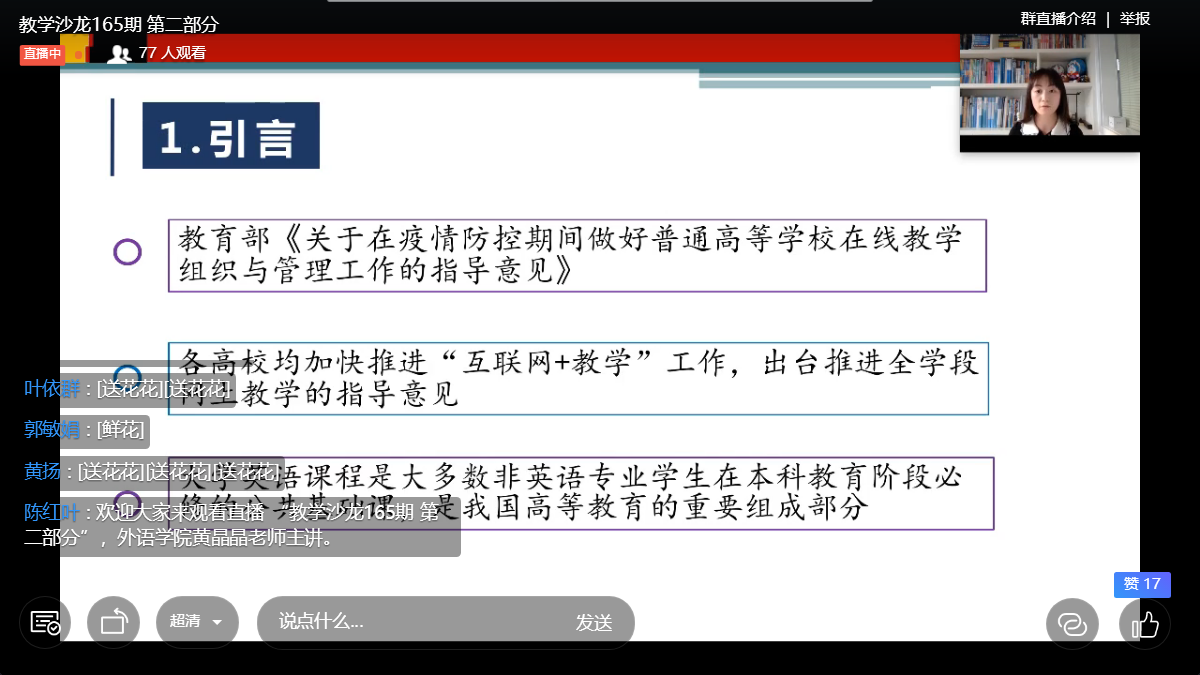针对老师们关心的云课堂具体实践及教学评价情况,黄老师以第三周教学设计为例,从课前驱动、课中促成、课后拓展三点,展示了国际交流英语云课堂的具体实施流程,并通过问卷调查展示了教学效果评价情况。并根据实操中遇到的情况与反思教学过程,提出了“直播课前需做好多套教学设计预案”、“‘软硬兼施’实现学生云课堂学习的远程监管”、“充分调动与激励学生的积极情感因素,最大程度调动学生学习积极性”等三点建议。