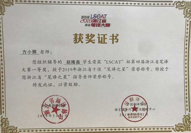 第四届浙江省“LSCAT杯”笔译大赛也是我省近年来最重要的翻译赛事,对译文要求较高,得奖率设置得不高,全省一等奖得奖率仅有3%,二等奖为7%,三等奖为10%,优胜奖为35%。此次比赛外语学院共组织三级片 179名选手参赛,其中英译汉128名,汉译英51名。三级片 学院专门为参赛选手分配了翻译指导老师。在英语系方小卿、韩晓亚、冯巧娥、吴青老师的细心指导下,三级片 大赛成绩斐然。三级片 学子斩获省级一等奖5名,二等奖2名,三等奖2名,优胜奖15名,其中英语17级赵隆鑫同学获得浙江省口译之星的称号。