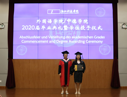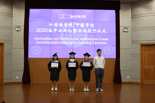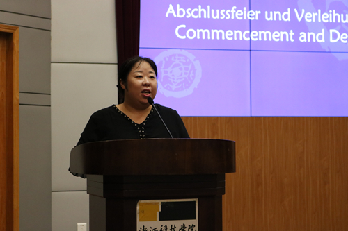 在学位授予仪式环节,每位毕业生依次上台,由校学位委员会委员、学院院长朱吉梅教授拨穗并合影留念。