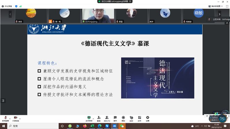 12月14日,“中德荟”讲坛第23期暨浙江科技学院教学论坛第172期如期举行,浙江大学德语学研究所副所长刘永强副教授以“数字化教学的方法、路径与实践——以慕课《德语现代主义文学》为例”为题作专题报告。讲座由三级片 胡一帆副教授主持。三级片 及外院30余位师生聆听了在线报告。