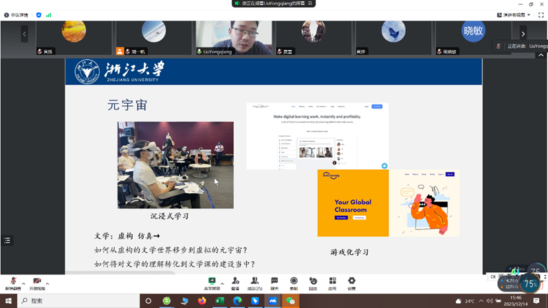 报告中刘老师介绍了数字化和人工智能变革以来,新媒介的发展加速了技术与教育的融合,构建了教学模式的新形态。近年来兴起的线上课程如mooc、spoc以及线上教学、线上线下混合式教学、虚拟仿真课堂和教育元宇宙已成为教学实践的常态。这为重新审视教育技术在日常教学实践中的应用提供了新的视角,而且还为厘清技术手段与(外国语言文学)教学模式的关系设置了全新的坐标体系。本报告以省一流线上课程《德语现代主义文学》为例,介绍该课程在建设和数字化教学方面的方法、路径和实践经验。