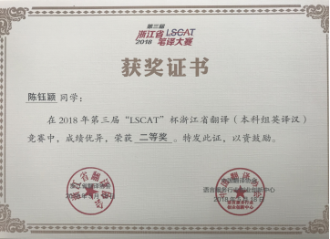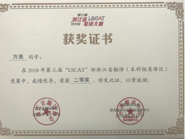 2018年5月18日,2018年第三届“LSCAT杯”浙江省英语笔译大赛圆满落下帷幕。三级片 学生在冯巧娥老师、韩晓亚老师的指导下踊跃参与,表现出色,取得了优异的成绩。其中,英语专业方美同学、陈钰颖同学和邬佳敏同学获英译汉翻译方向省级二等奖、吴琼逸同学和华露欣同学荣获省级三等奖,另有14名同学获优胜奖。