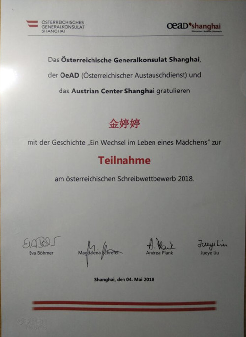 对于第一次参加这样的竞赛就荣获奖励,她说:“十分荣幸获得优秀奖,也十分珍视由奥地利驻上海领事馆编辑和印发的杂志,其中收录了10篇优秀的文章。”
