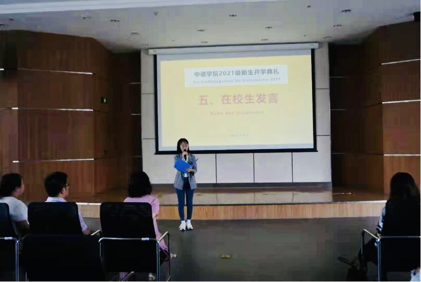 主持人还连线了2位留德学生,请他们分享自己在德国的留学经历,点燃了在场新生们出国学习的热情。新生代表王子豪的发言,传递出了同学们对大学生活的期待,洋溢着青春活力的气息。