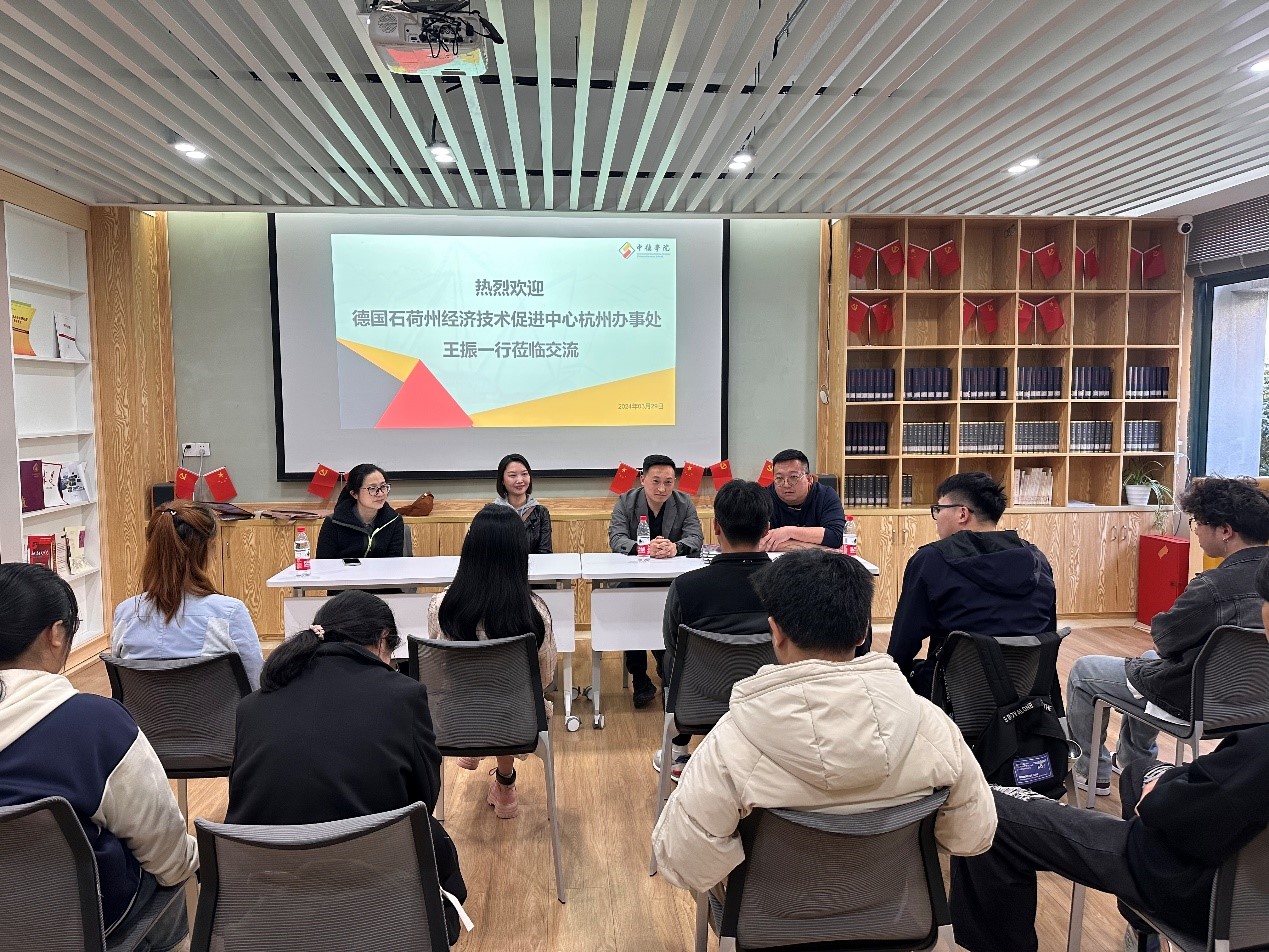 2024年3月29日德国石荷州经济技术促进中心杭州办事处副主任王振一行到访三级片 ,他们与德语专业大三学生介绍了办事处概况,并为学生未来的就业提供了宝贵意见。三级片 党委副书记茹潇潇参与本次交流会。